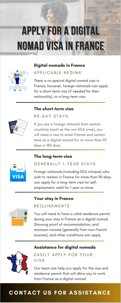 A digital nomad has a flexible work schedule and lifestyle, and, depending on your preferences, there may be more than one model that suits your needs to enter France. You can always discuss your options with our French immigration specialists.