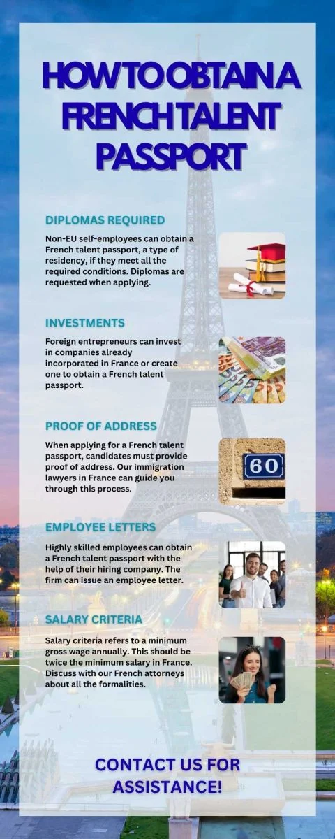 Our specialized immigration attorneys in France can offer additional support regarding the application for the French talent passport and the categories involved. Plus, you can also explore this infographic: