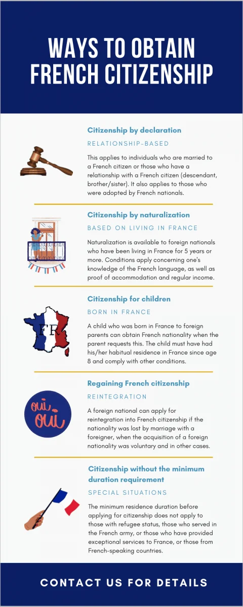 The application process is simplified for those who are able to apply for citizenship based on the right of soil (jus soli) – the situation in which they were born in France by at least one French parent and later relocated to another country by the will of their parents, for example, the United States. In this case, the birth certificate is the most important document to be provided. Below is an infographic with details on French citizenship: