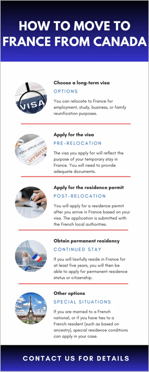 Canadian nationals interested in obtaining French residency can reach out to our team of experts for more information on the particular conditions that apply in their case. Relocating from Canada to France is understandably easier for Canadians who live in Quebec, or other French-speaking cities, however, sufficient French language knowledge can be adequately provided for through specific documentation.